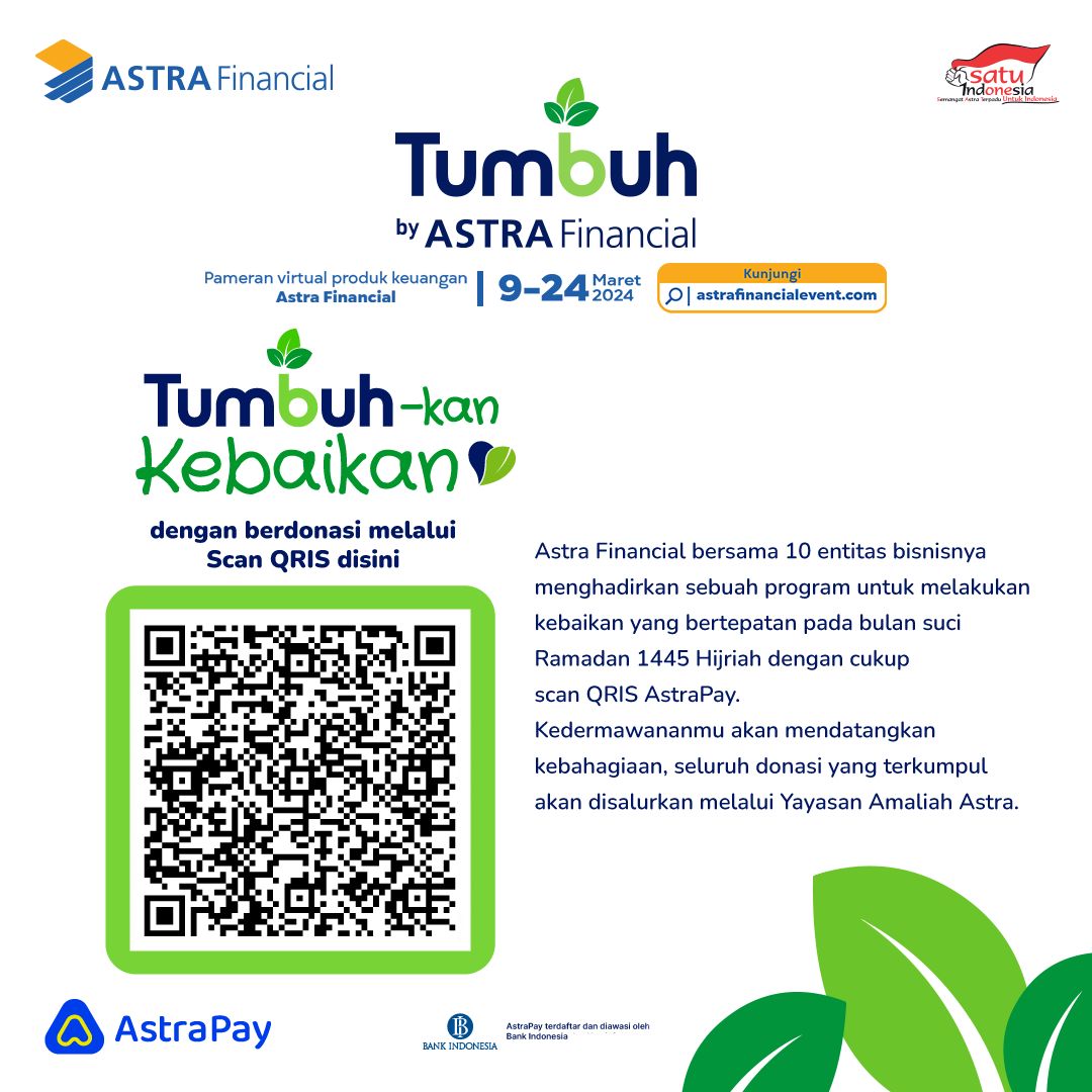 Dalam rangkaian program “Tumbuh-kan Kebaikan, Astra Financial juga menyediakan kesempatan bagi masyarakat yang ingin berpartisipasi dalam aksi kebaikan. Bersama dengan 10 unit bisnisnya, Astra Financial menghadirkan sebuah program kebaikan yang bertepatan pada bulan suci Ramadhan 1445 Hijriah dengan cukup scan QRIS AstraPay. Di mana seluruh donasi yang terkumpul akan disalurkan melalui Yayasan Amaliah Astra (YAA). Melalui kerja sama dan kolaborasi di “Tumbuh-kan Kebaikan” ini, Astra Financial berharap dapat menjadi agen perubahan yang mampu memberikan dampak positif bagi masyarakat, terutama bagi mereka yang membutuhkan.
