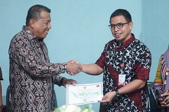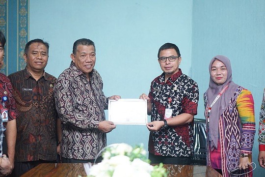 Dalam kunjungan kerja tersebut Bupati menerima langsung Sertifikasi Akreditasi dari Perpustakaan Nasional Republik Indonesia yang di serahkan oleh kepala dinas Perpustakaan dan kearsipan daerah Provinsi Sulawesi Utara.