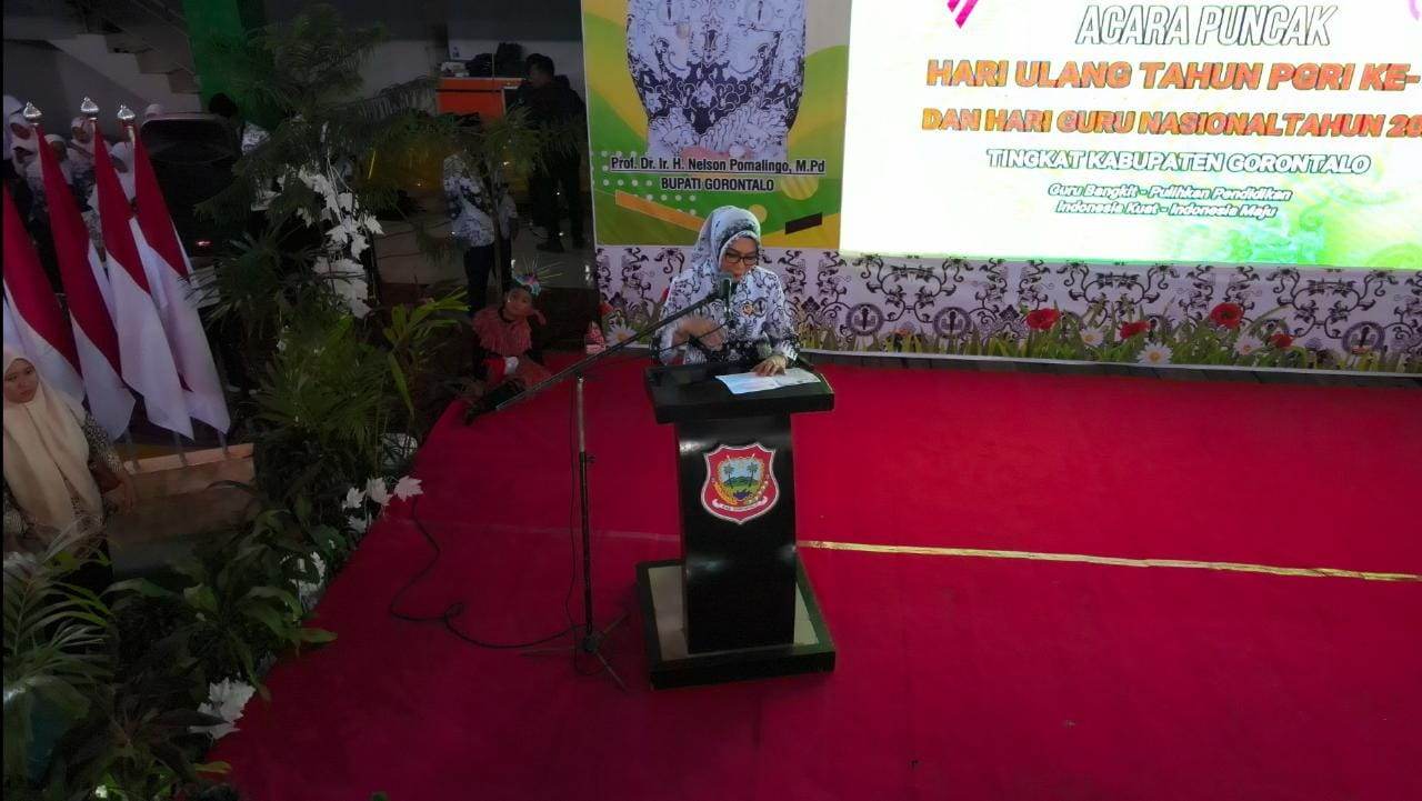 Dalam laporannya, Ketua PGRI Kabupaten Gorontalo Prof. Fory Naway menerangkan, hari ini, kembali kita mengenang sejarah 77 tahun lalu, teoat seratus hari setelah proklamasi kemerdekaan RI, 25 November 1945, PGRI hadir sebagai wadah perjuangan guru, pendidik dan teanga pendidikan dalam memperjuangkan kedaulatan negara kesatuan republik Indoensia,berperang melawan kebodohan dan keterbelakangan serta berhidmat pada negara dalam memajukan pendidikan Nasional.