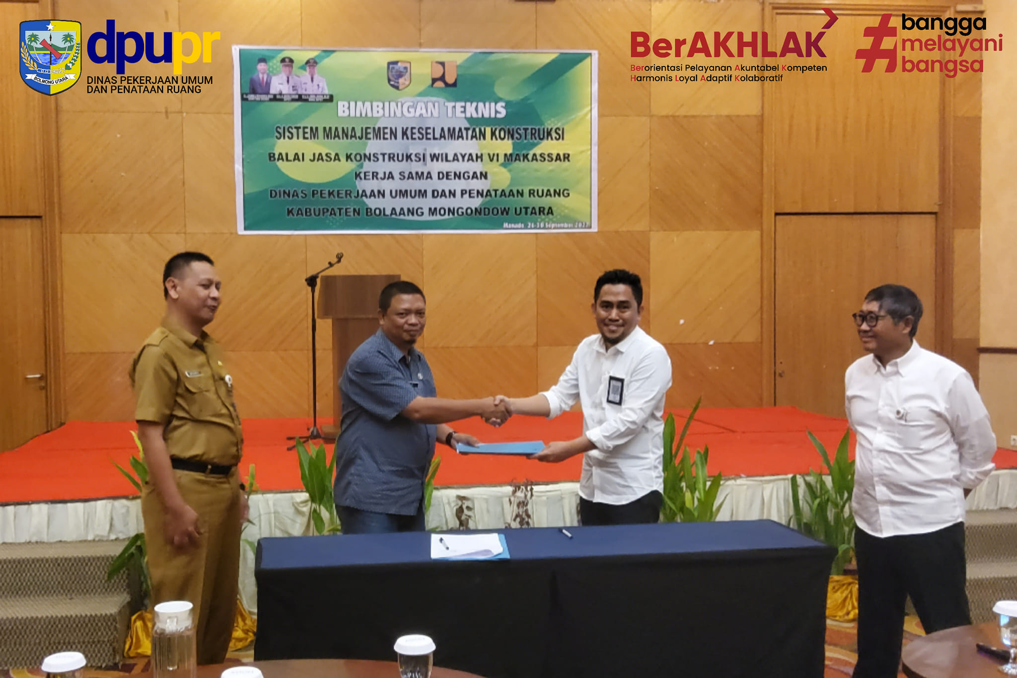 POJOKberita.id, MANADO – Bertempat di Aston Hotel Manado Kepala Dinas PUPR Rudini Masuara ST, melakukan Memorandum of Understanding (MoU) dengan Balai Jalan Konstruksi Wilayah IV Makassar disaksikan oleh Asisten Bidang Pemerintahan dan Kesra Setda Kabupaten Bolaang Mongondow Utara Rahmat Pontoh dan Wakil Ketua Lembaga Pengembangan Jasa Kontruksi (LPJK) Selasa (27/09/2022).
