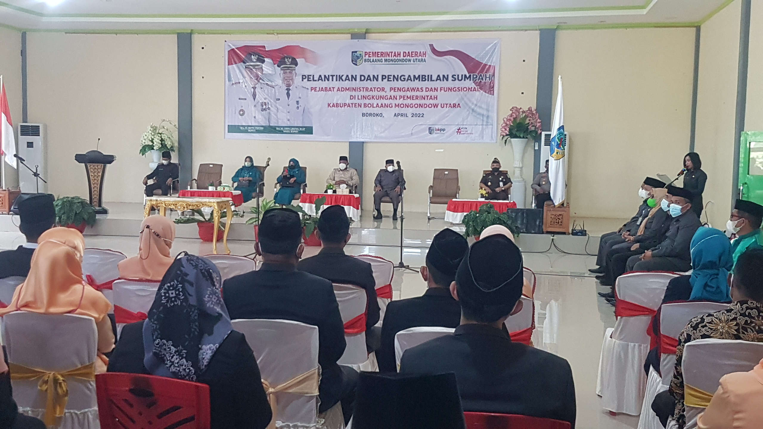 Administrator, Jabatan Pengawas dan Jabatan Fungsional di Lingkungan Pemerintah Kabupaten Bolaang Mongondow Utara (Bolmut) dilantik langsung oleh Bupati Drs.Hi.Depri Pontoh ,di Gedung DWP Pantai Wisata batu pinagut kamis (14/4/22).