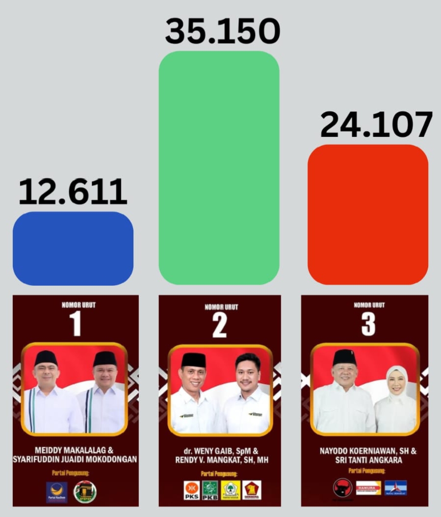 “Kemenangan ini adalah kemenangan seluruh masyarakat Kotamobagu. Terima kasih atas kepercayaan dan doa yang telah diberikan kepada kami. Kami berkomitmen untuk bekerja keras membawa perubahan dan mewujudkan visi pembangunan yang lebih baik bagi Kotamobagu,” Tutup Weny.