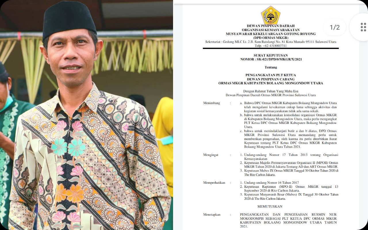 POJOKberita.id, BOLMUT_Rusmin Nur Mokodompis Resmi dilantik Sebagai Pelaksana Tugas (Plt) Ketua Dewan Pimpinan Cabang DPC organisasi masyarakat, Musyawarah Kekeluargaan Gotong Royong ( MKGR ) Kabupaten Bolaang Mongondow Utara (Bolmut), bertempat di Boroko, Senin ( 06/11/2021).